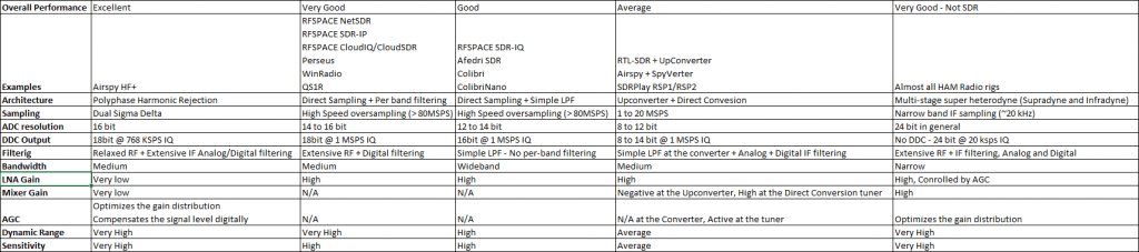 The Airspy team also compiled this comparison chart for us to understand the differences in architecture between the current SDRs on the market.