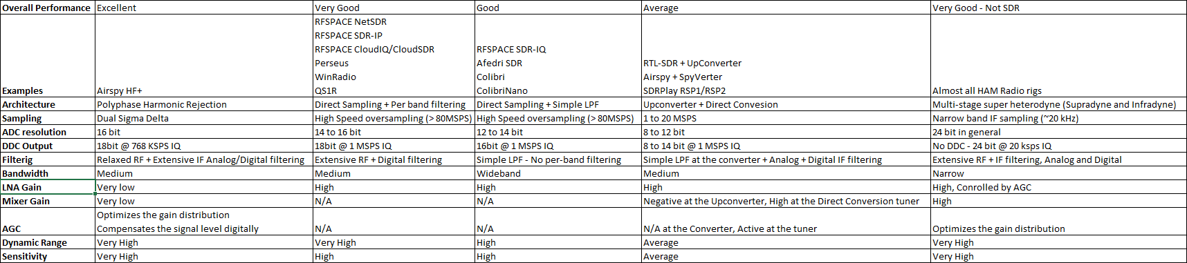 The Airspy team also compiled this comparison chart for us to understand the differences in architecture between the current SDRs on the market.