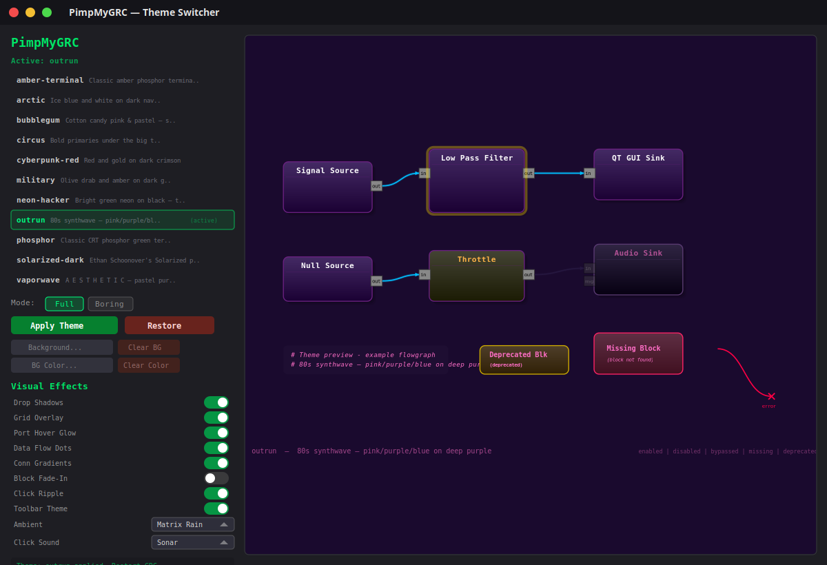 Replaces GRC's stock look with fully themed colors, block rendering, connections, and ports. Includes a GTK4 theme switcher with a live animated preview so you can see exactly what you're getting into before you commit.