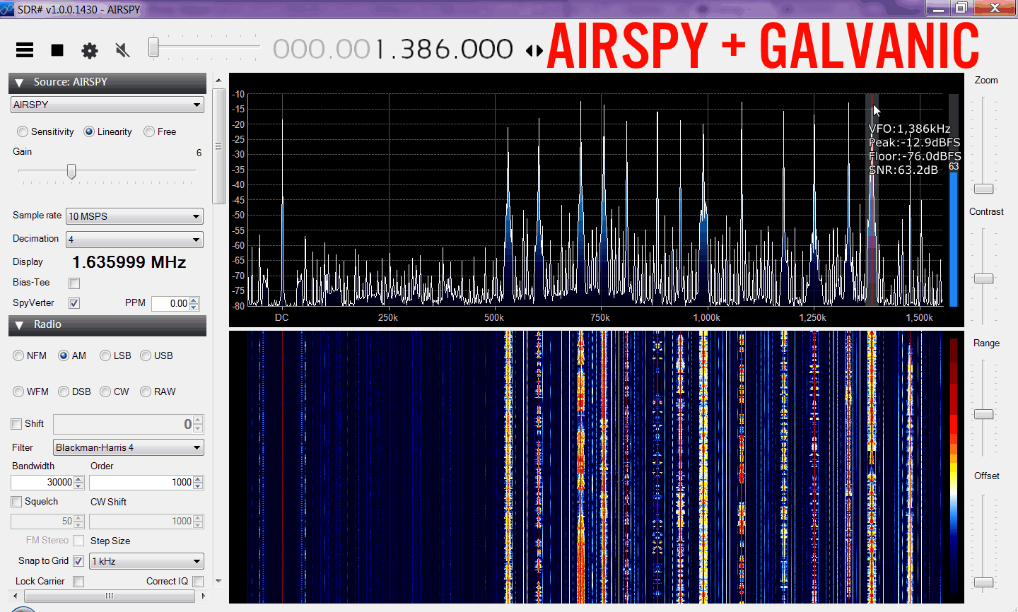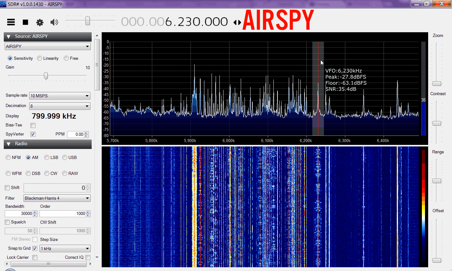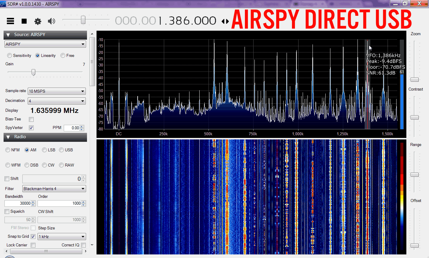 Here we tested the maximum SNR obtainable on the AM band with a long wire antenna. We ran the RSP at 1.536 MHz (actual bandwidth was actually around 1.646 MHz) and the Airspy at 10 MHz with decimation 4 or 2.5 MHz, cropped down to 1.6 MHz. The FFT interpolation addition for the Airspy was then 3 * (2.5 - 1.6) / 1.25 = +2.16 dB.
