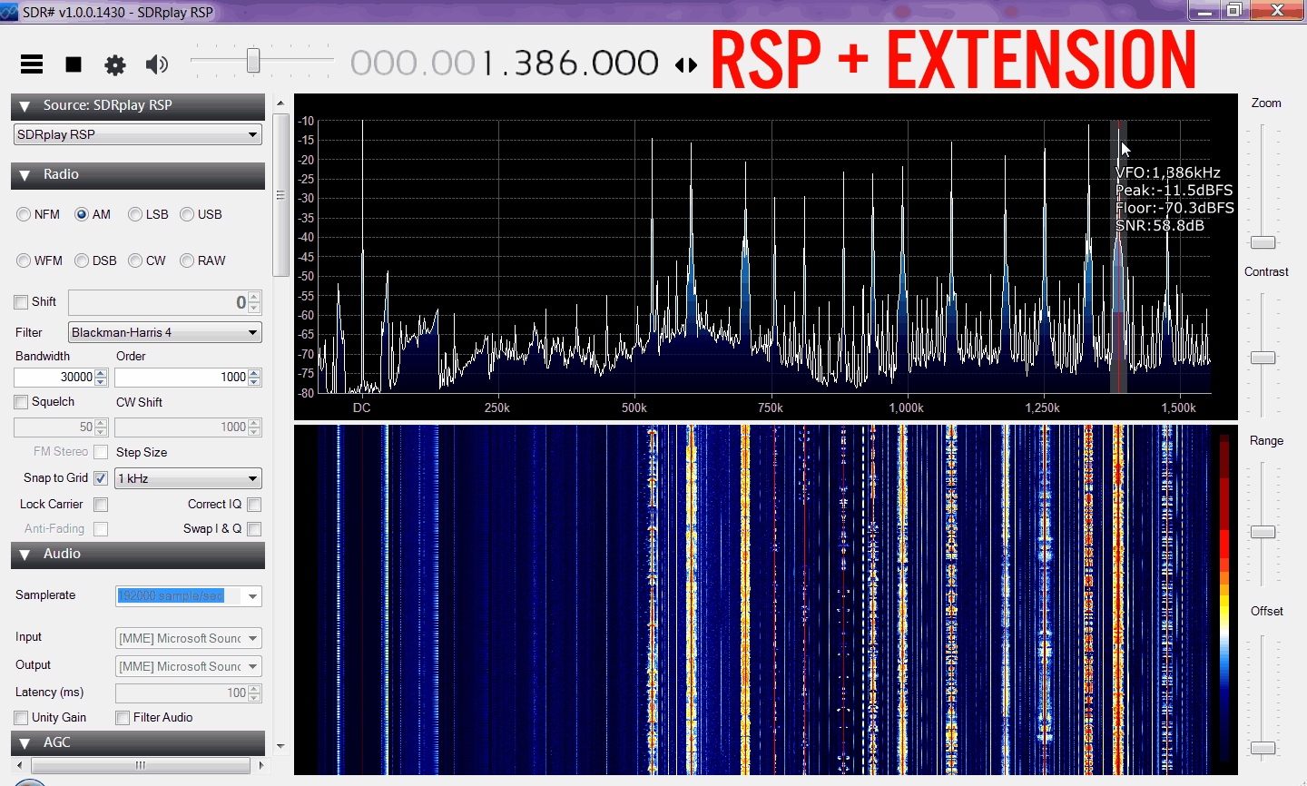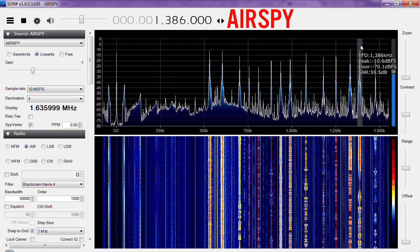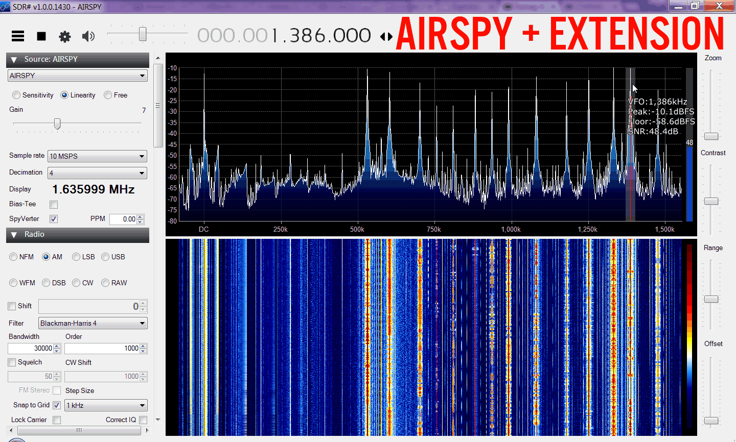 Here we tested the maximum SNR obtainable on the AM band with a long wire antenna. We ran the RSP at 1.536 MHz (actual bandwidth was actually around 1.646 MHz) and the Airspy at 10 MHz with decimation 4 or 2.5 MHz, cropped down to 1.6 MHz. The FFT interpolation addition for the Airspy was then 3 * (2.5 - 1.6) / 1.25 = +2.16 dB.