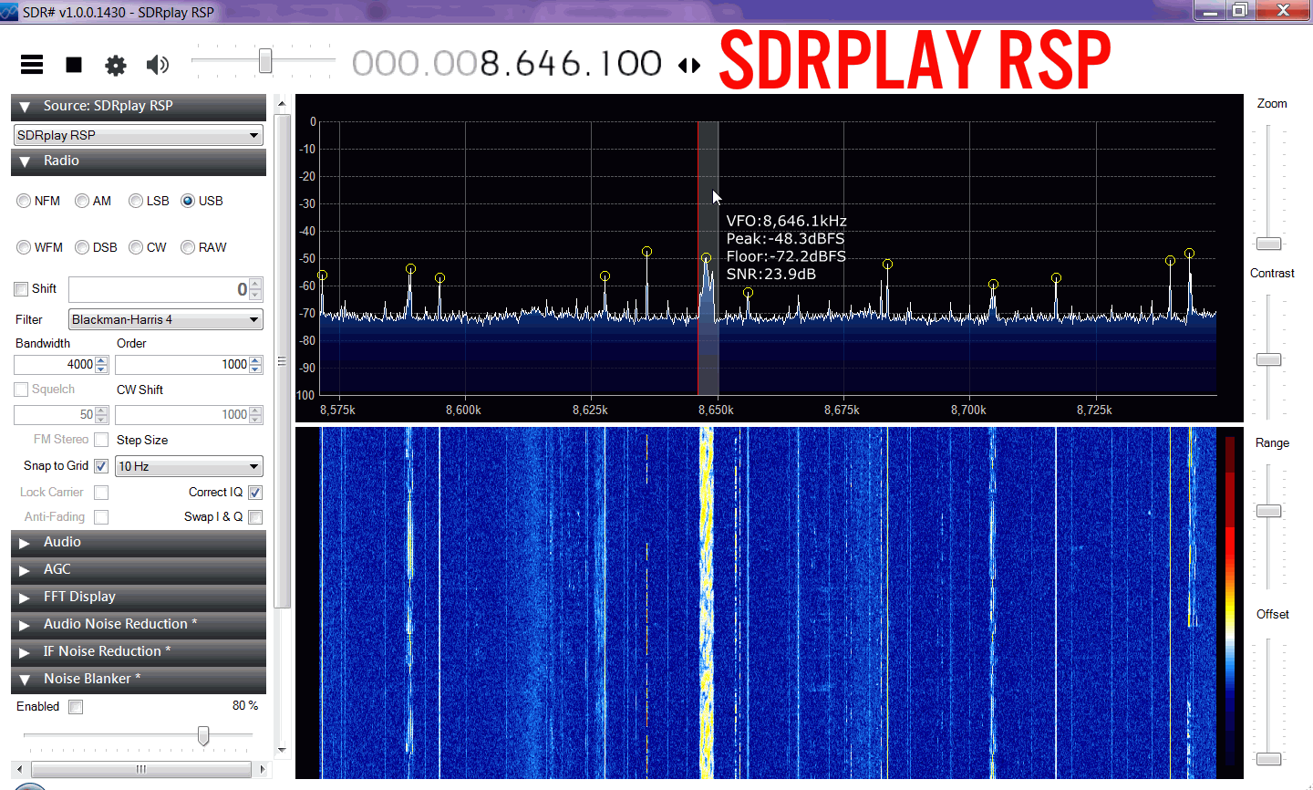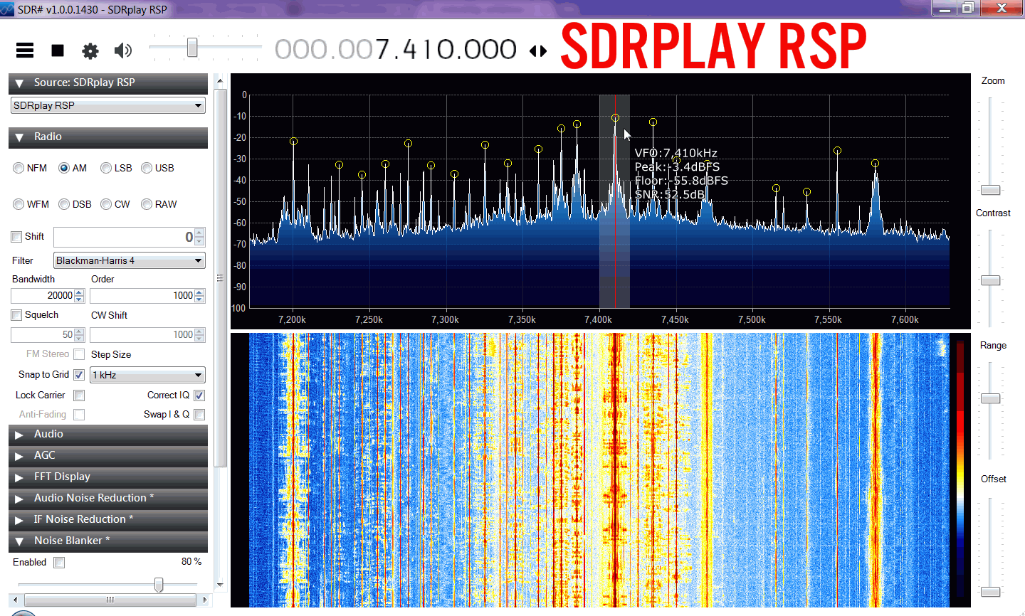 The RSP has the option to reduce its IF filter down to 200 kHz in order to improve dynamic range by better blocking in band interferers. However, we didn't really see much improvement when reducing the bandwidth like this. There was maybe at most a 1-2 dB improvement.