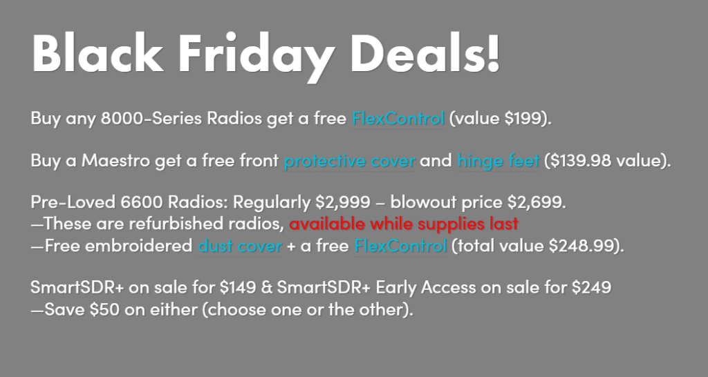 FlexRadio offers high-end SDRs aimed at ham radio users. They are currently running a Black Friday deal as shown in the screenshot. https://www.flexradio.com/products/categories/black-friday/